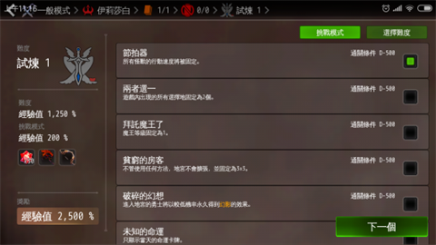 此时难度可选择试炼,经验值会大幅提升,额外难度可酌情选择两个,角色依旧选择伊丽莎白。