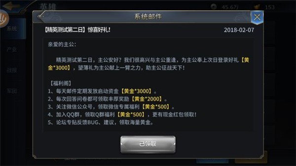 从测试的第二日起,每日中午12点通过邮件发放测试福利【黄金*3000】!