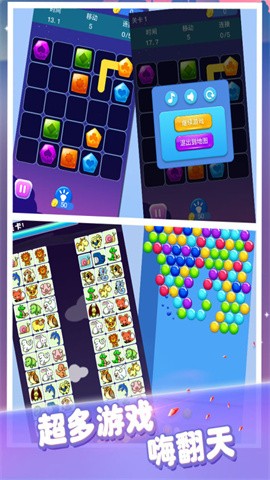 3、疯狂宝石,玩家点击三个或以上相同颜色的宝石进行消除,类似于消灭星星的玩法,单次消除宝石越多,得分越高,过程中还能获得各种道具。