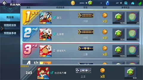 2、排行:排行榜上总计显示三个排行,分别为竞技场排行、军团每周活跃榜以及军团赛季榜。通过排行,玩家可以了解自己在游戏中的位置和竞争情况。