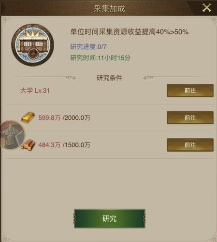 3、大学科技中有“采集加成”项目,能显著提升采集资源的收益!