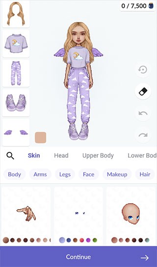 4、还可以为虚拟形象选择不同风格的包包。完成装扮后,点击底部的“continue”箭头。