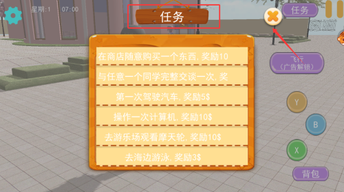 2、点击游戏界面右上角的任务选项,可查看需完成的目标任务,诸如在商店任选一件物品购买、与任意一位同学进行一次完整对话、首次驾驶汽车等。完成这些挑战便能领取丰厚奖励。