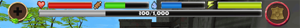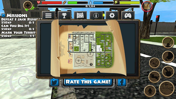 屏幕上方有五条状态栏。最下方最长的是经验值条,满了之后狗狗会升级,属性提升且其他四条状态栏也会满。第一条是健康值,关乎狗狗的生命,若为空则游戏结束。第二条是饥饿值,通过吃东西补充。第三条是渴度,喝水可恢复,若饥饿值或渴度为空,健康值会持续下降,健康值为空游戏同样结束。最后一条是耐力值,影响跑步距离,耐力耗尽后原地休息即可恢复。由于游戏即时保存,状态栏不佳时可退出再进入恢复状态,但状态良好时不建议使用此方法。