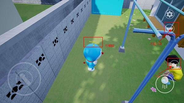 4、如图所示,点击哆啦A梦胸前的万能口袋,选择并装备竹蜻蜓,此时右下角会出现Fly按钮,点击即可升空;