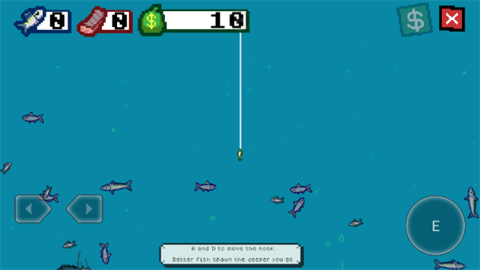 2、前往最左侧的钓鱼台,点击E键启动钓鱼环节。钓鱼线会自动下落,可通过左右方向键控制其移动方向。用鱼钩撞击鱼类造成伤害,累积足够伤害后即可将鱼钓起。