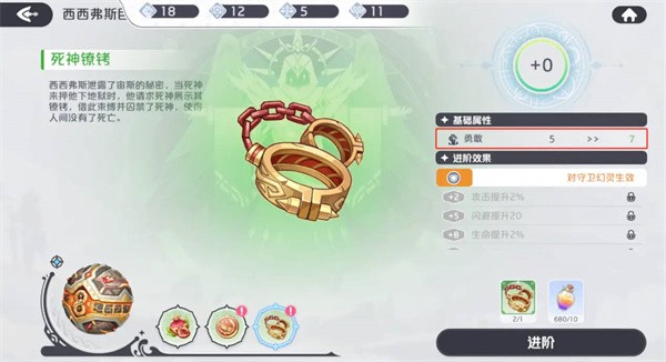 【神器进阶】神器升阶分为宝物进阶和神迹进阶。宝物进阶需消耗相同宝物和材料,进阶等级以+n形式展示;当神迹关联的宝物都进阶一次后,可对神迹本体升阶。进阶可提升数值加成,且在特定等级(2+3的倍数)时,增益效果会额外提升。