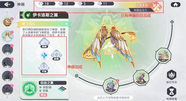 【神器装备】集齐成套宝物激活神器后,需将神器装备在主角身上以获得加成。点击神器界面右下角“神器装备”按钮进入装备页面。