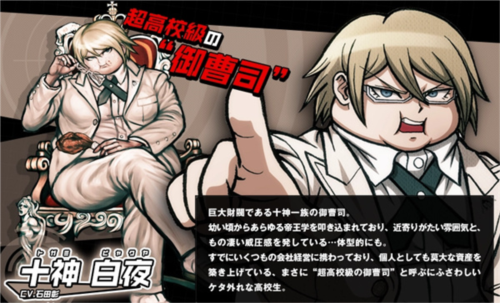 十神财团继承人,自幼接受帝王式精英教育。极度傲慢,轻视他人,崇尚上流品味,言行间充满优越感。尽管态度高高在上,实则内心正直善良。