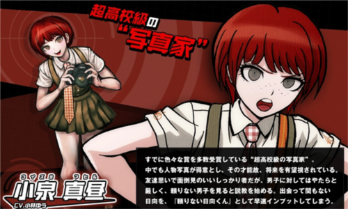 沉默寡言的游戏天才,常穿黑猫兜帽衫。精通各类电子游戏,专注力极强,甚至能在自我介绍时同步打游戏。日常稍一放松便容易犯困,但在搜查与学级裁判中始终是日向最可靠的支援者。与狛枝同被黑白熊誉为“学级裁判的得分手”。