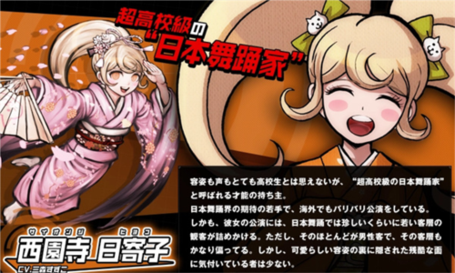 外貌如孩童般娇小,舞艺精湛,海外公演广受年轻观众欢迎。性格毒舌,与罪木关系紧张,但和小泉真昼交情甚笃。