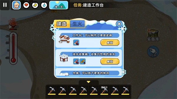 1、在找到合适地点后,玩家可以收集冰块、木材等物资,获取水资源和建造材料。
