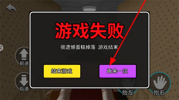 4、一旦蛋糕不慎掉落导致游戏失败,只需点击“再来一次”按钮,即可立即重新开始,继续挑战成功送达蛋糕的目标。