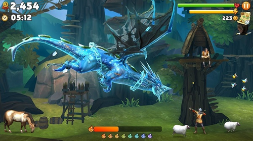3、游戏中的生物有:人(农民骑士等)、地精、人畜无害的鸟类、各类猛禽、猪牛羊、蜘蛛、各种飞龙等,不同尺寸的飞龙所能捕食的动物都不同,玩家可以通过金币解锁、培养、装扮自己的飞龙。