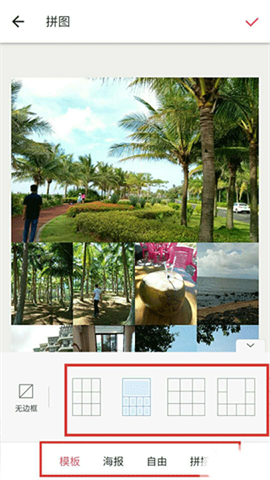 4、完成模板和排列方式设置后,点击右上角的“√”符号,确认拼图完成。