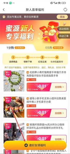 2、在新人首单福利页面,有“1分购”等活动。用户可选择商品、领取优惠券并下单,通过红包立减后,最低可享受0.01元起的支付优惠。