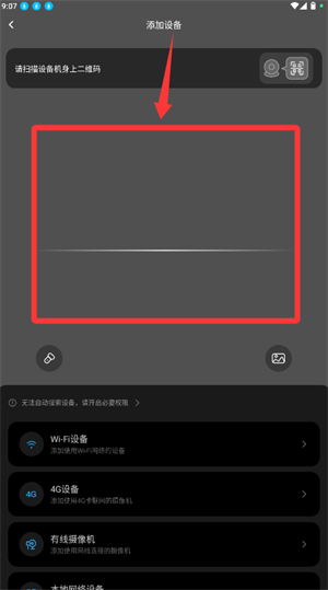 3、在添加页面中启用扫码工具,对准设备特有的二维码进行扫描识别。