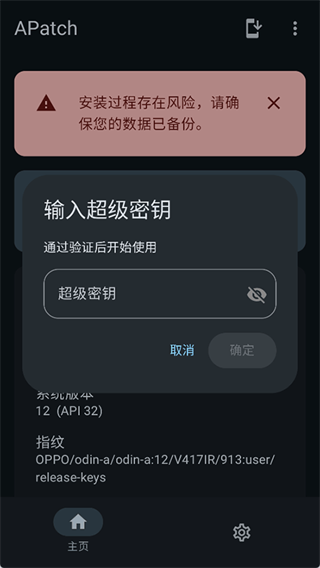 将修补后的镜像刷入并重启设备后,首次打开APatch应用时,会提示输入此前设定的超级密钥。正确输入后,方可激活完整的Root权限与内核控制能力。