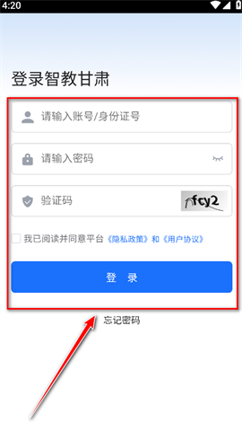 打开甘肃智慧教育云平台,输入账号(或身份证号码)、密码以及验证码,勾选“我已阅读并同意平台《隐私政策》和《用户协议》”,最后点击“登录”按钮即可完成登录。