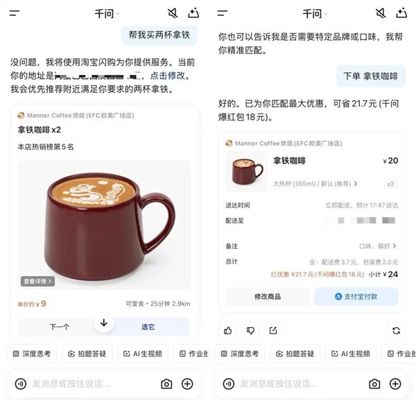2、用户只需在对话框中输入如“帮我点一杯奶茶或“订两杯咖啡等语音或文字指令,千问便会自动调用淘宝闪购的本地配送服务。