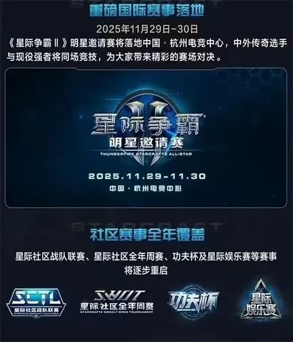 暴雪公司宣布,2025年11月29日至30日,《星际争霸Ⅱ》明星邀请赛将在杭州电竞中心举办。此外,国服将与中国邮政合作,推出《星际争霸Ⅱ》系列联名文创产品,包括邮票、纪念章等限量版收藏品。