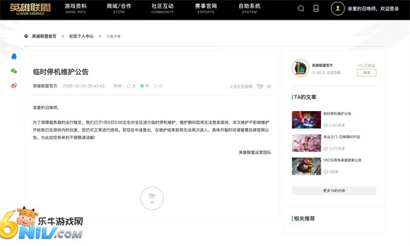 1月5日最新消息,根据《英雄联盟》国服官网信息,该游戏在今日凌晨5点左右对全服进行了临时停机维护。在维护期间,玩家无法登录游戏。不过,对于维护开始前已经处于游戏内的玩家,他们可以继续正常游戏。如果玩家在维护过程中中途退出游戏,那么在维护结束之前将无法重新进入。官方提醒,游戏重新开放的具体时间请关注后续官网公告。